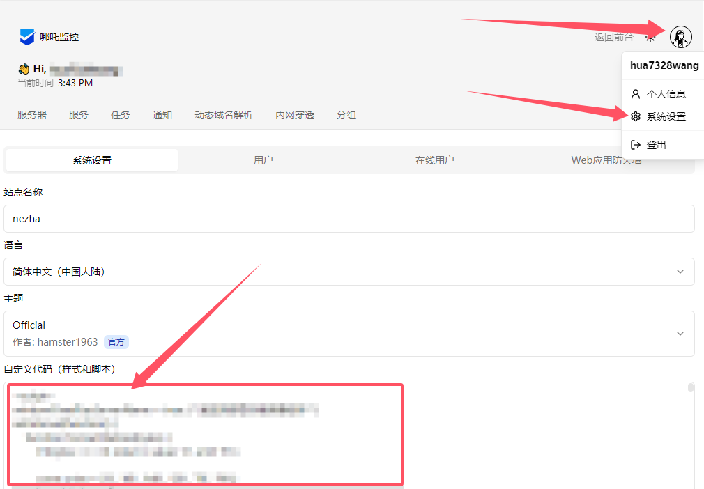 如何做到呢,很简单,先把探针加入流量告警提示,再在系统面版的自定义代码处加入如下代码,刷新页面就显示了。